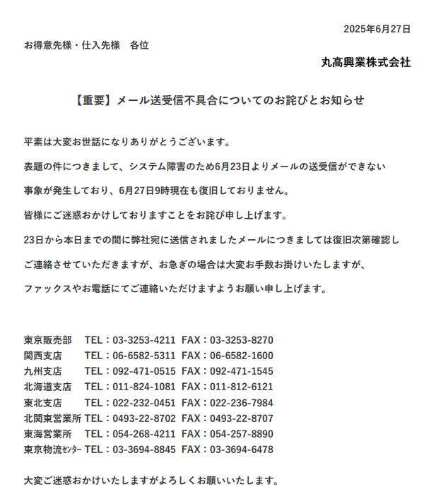 表題の件につきまして、システム障害のため6月23日よりメールの送受信ができない事象が発生しており、6月27日9時現在も復旧しておりません。