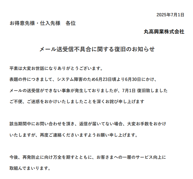 表題の件につきまして、システム障害のため6月23日頃より6月30日にかけ、メールの送受信ができない事象が発生しておりましたが、7月1日 復旧致しましたご不便、ご迷惑をおかけいたしましたことを深くお詫び申し上げます。