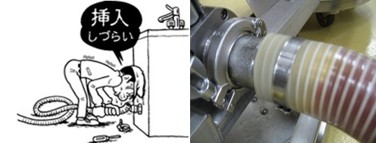 衛生面を保つため定期的にホースと継手をバラして洗浄を実施しておられました。使用するホースが大口径のため、継手とホースをバラして再び組み付ける際に、ホースニップルへの挿入が大変困難で困っておられました。女性の作業員も多く、組み付け作業に多くの時間を割いており改善策を探しておられました。